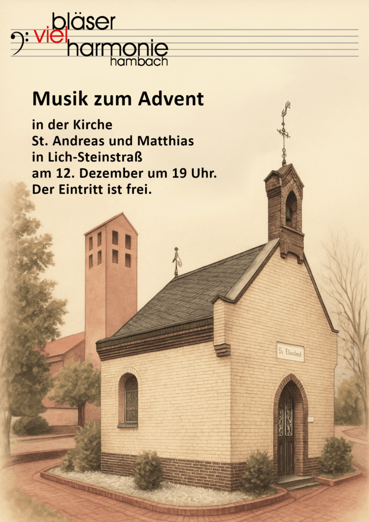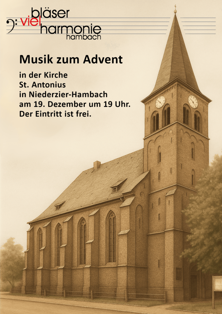 Jährlich lädt die bläservielharmonie hambach zu ihrem Adventskonzert ein, dieses Jahr im Rahmen des 60-jährigen Jubiläums mit einer Besonderheit: Das traditionell in Jülich gespielte Konzert wird zusätzlich in Niederzier-Hambach, dem Gründungsort des Vereins, zu sehen und zu hören sein. Am 12.12.2025 um 19:00 Uhr spielen die Musiker des sinfonischen Orchesters zunächst in der Kirche St. Andreas und Matthias in Jülich-Steinstraß, eine Woche darauf, am 19.12.2025, folgt zur gleichen Zeit das Konzert in Niederzier-Hambach.